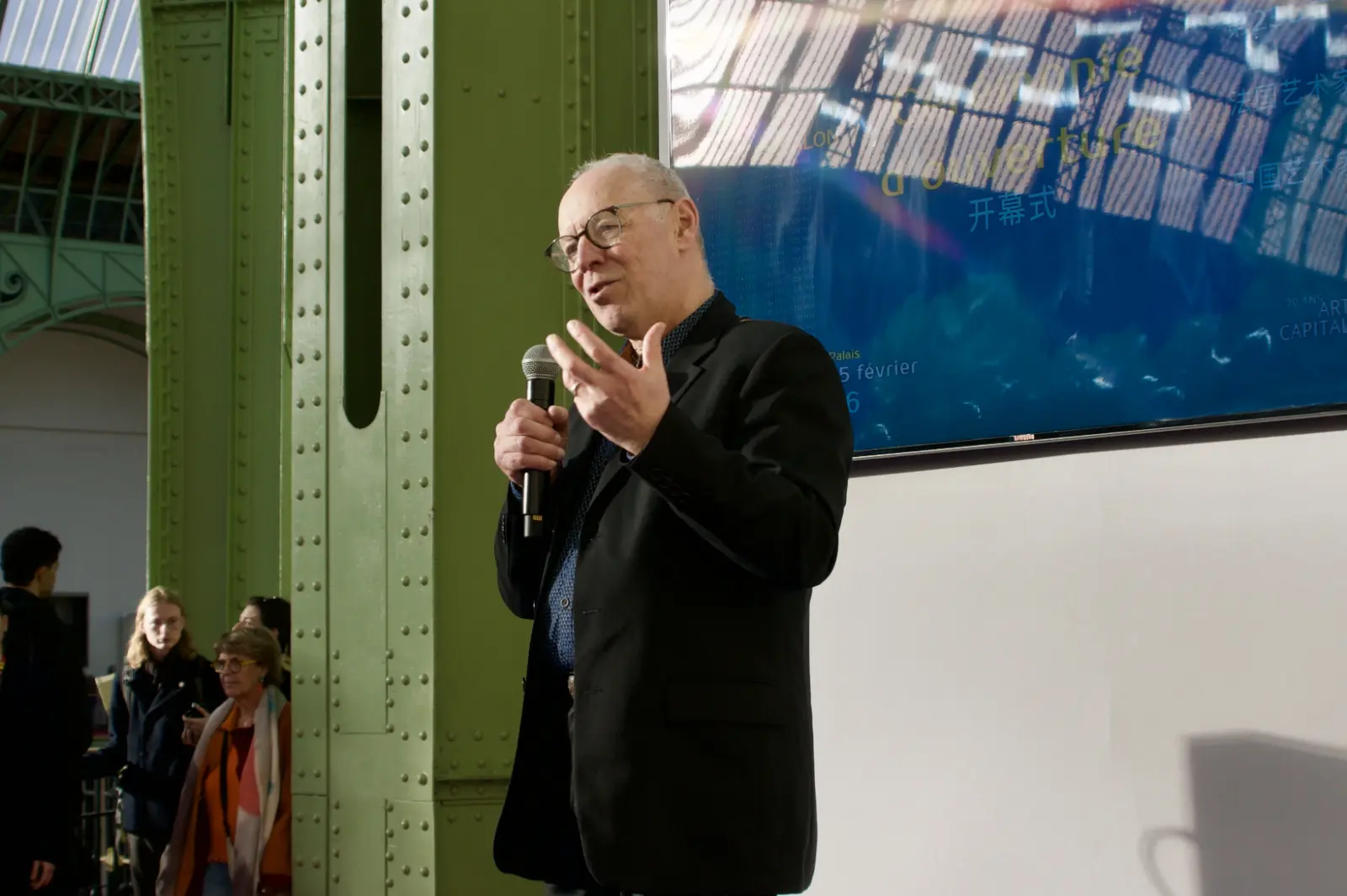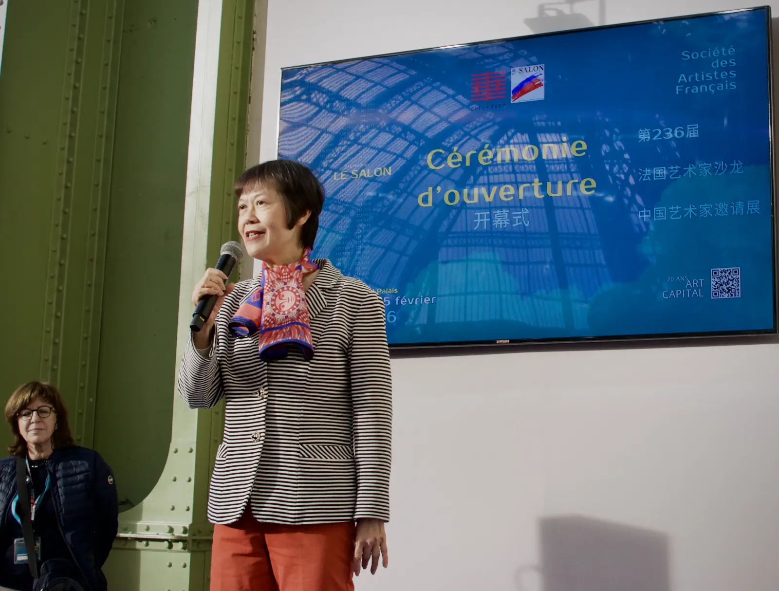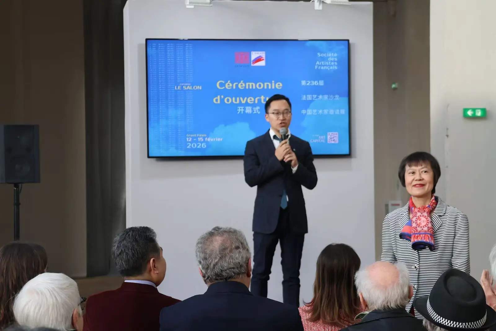 开幕式在巴黎大皇宫一层钟楼举行。中国驻法国大使夫人张华、中国驻法国大使馆文化参赞王茵,法国艺术家沙龙主席布鲁诺·马德莱纳(Bruno Madelaine),巴黎第八区区长珍妮·多特塞尔(Jeanne d’Hauteserre),法国文化部部长代表、巴黎七区第一副区长若曦亚娜·高德(Josiane Gaude),巴黎大皇宫主席代表奥罗尔·谢费尔(Aurore Schaefer), 联合国教科文组织工会主席马克西姆·布恩(Maxime Bun),小皇宫博物馆前馆长吉尔·夏查尔(Gilles Chazal),法国泰勒基金会主席让-弗朗索瓦·拉赫优(Jean-François Larrieu),法兰西艺术院通讯院士让-吕克·蒙特罗索(Jean-Luc Monterosso),法国美术家之家协会主席雷米·艾融(Rémy Aron),中国美术家协会理论委员会主任、本次展览策展人尚辉等嘉宾出席开幕仪式。开幕式由此次展览联合主办方中展欧洲代表张井主持。
