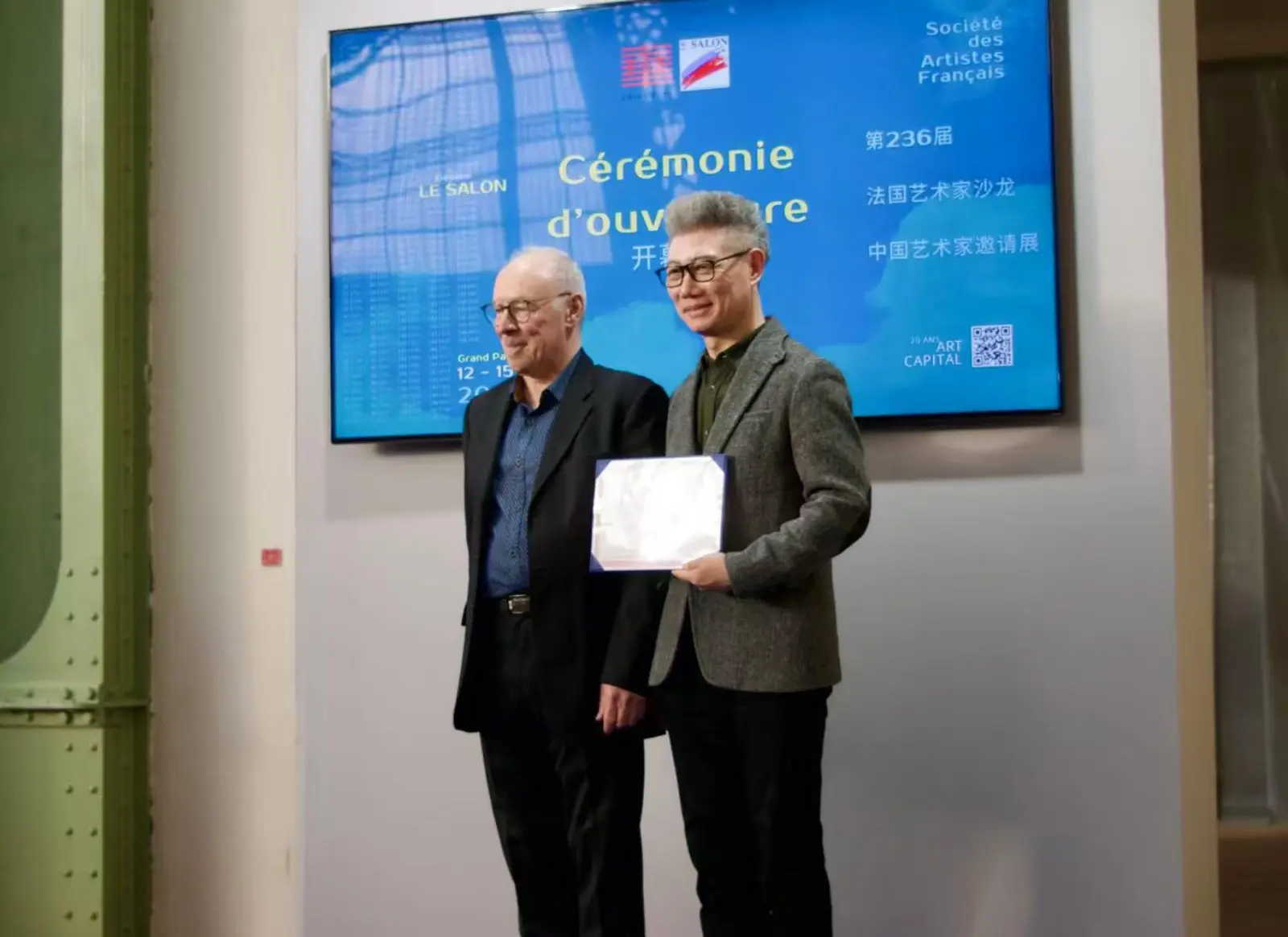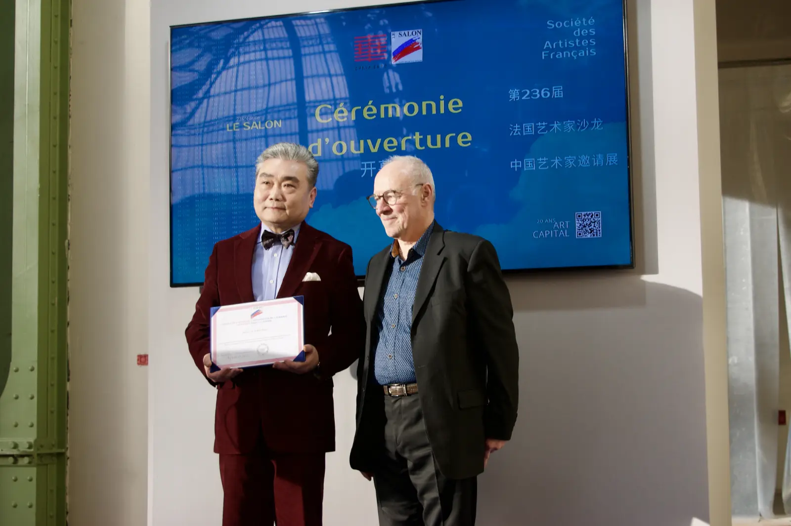 开幕式期间,法国艺术家沙龙主席还向中国展区策展人、中国美术家协会理论委员会主任尚辉,以及中国艺术家王盈授予“中法艺术交流大使”荣誉称号,以表彰其在促进中法文化交流与艺术合作方面所作出的贡献。